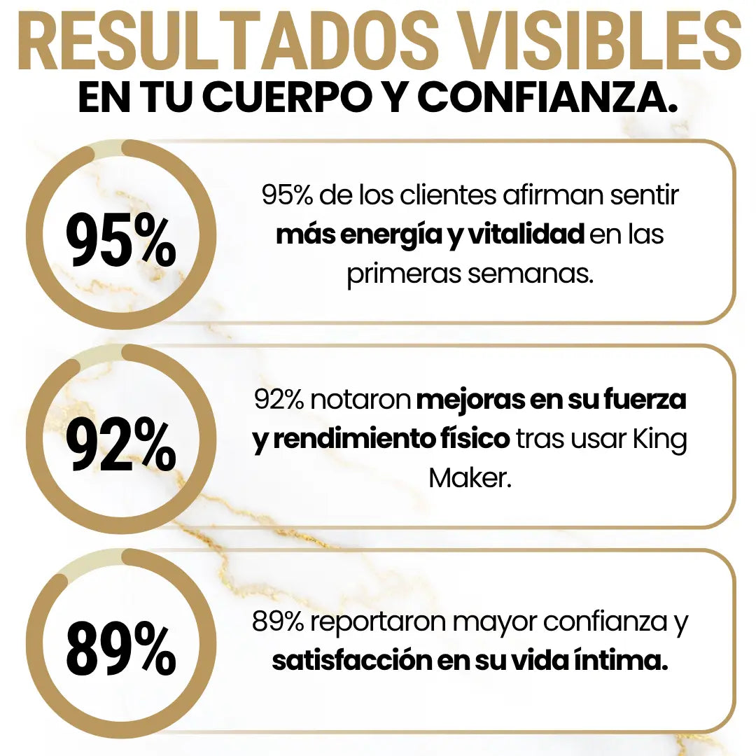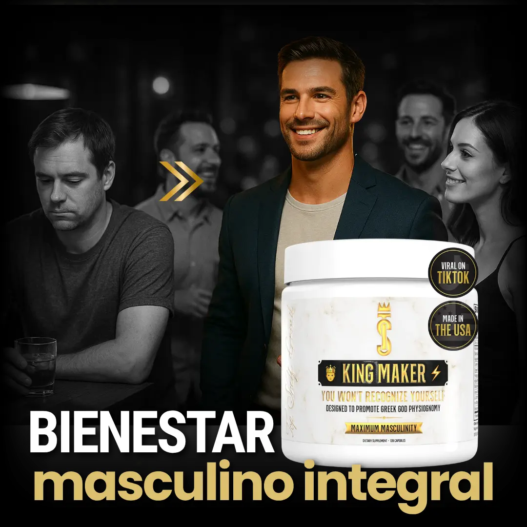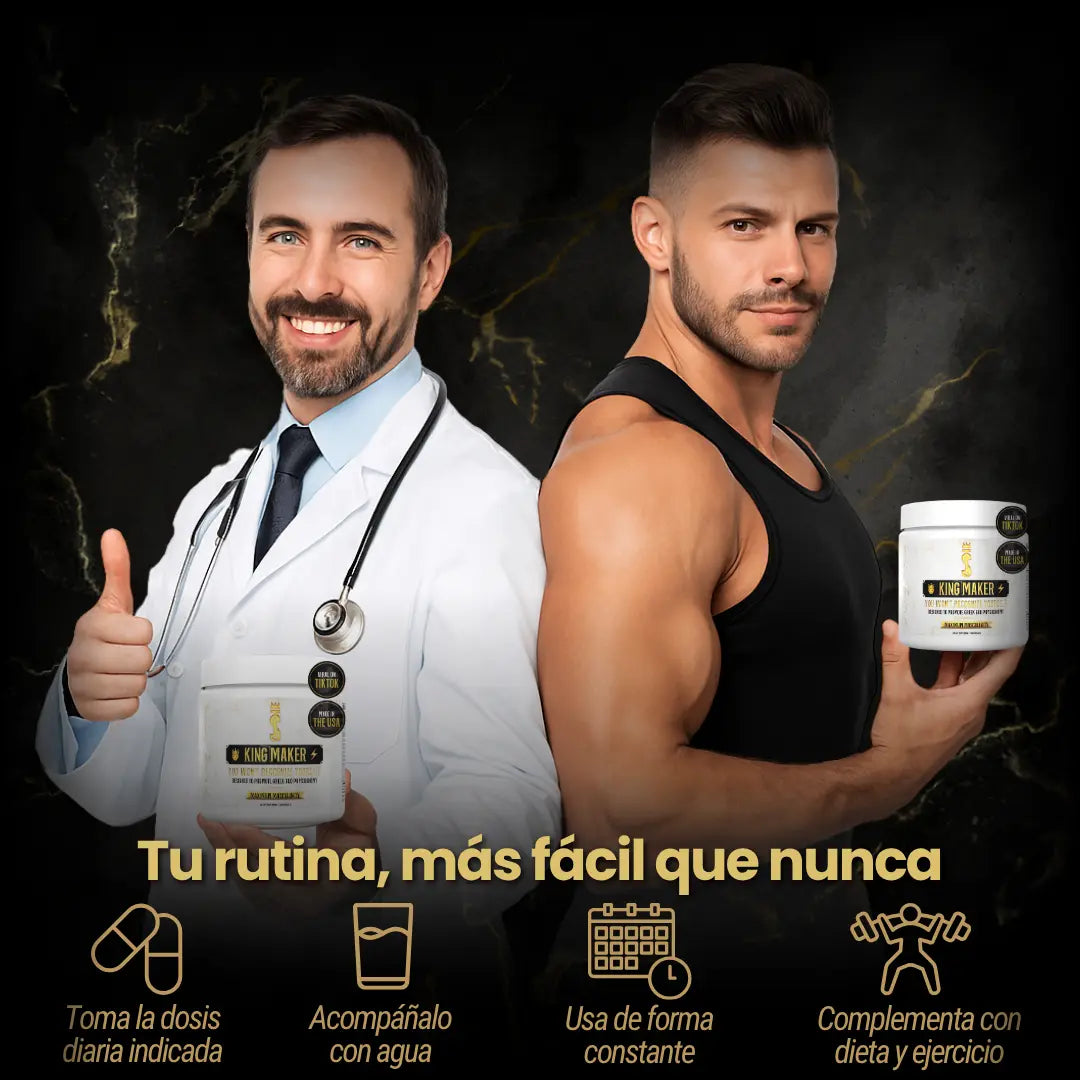 Muchos hombres entrenan duro pero no logran ganar masa ni mantener su energía y deseo. Esto genera frustración, baja autoestima y desmotivación. Con King Maker tienes una fórmula integral que acelera el músculo, refuerza los huesos y potencia tu confianza.