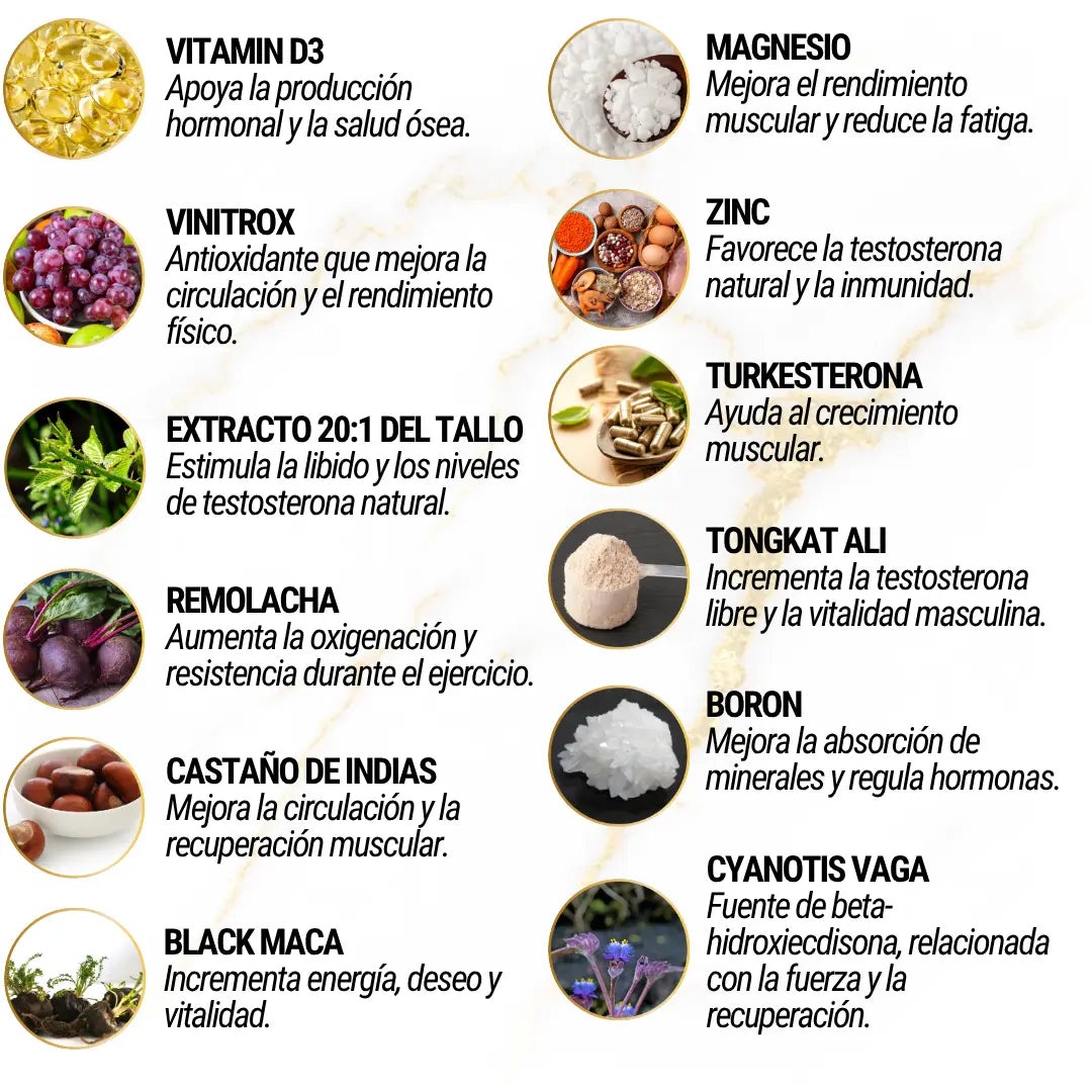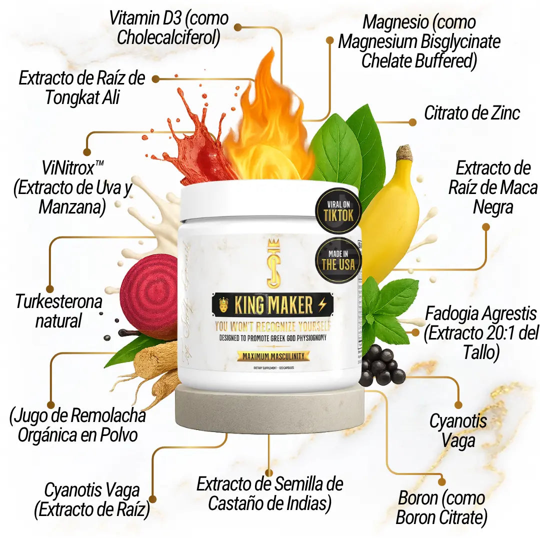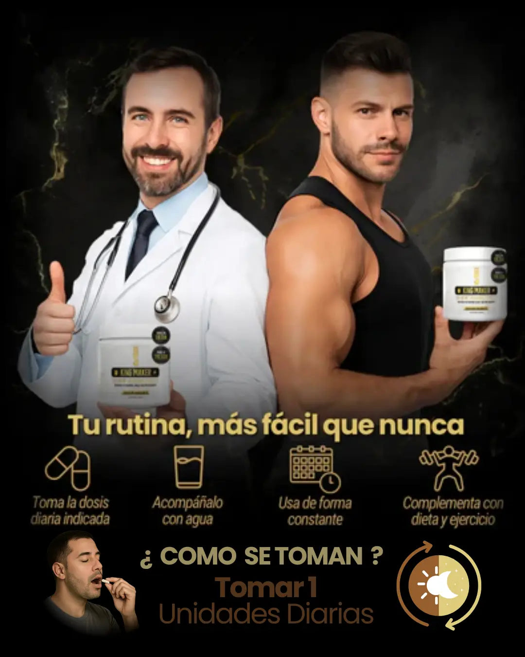 “Olvídate de tomar 3 o 4 suplementos distintos. King Maker reúne en uno solo soporte para tu estructura ósea, tu testosterona y tu desempeño físico e íntimo.”