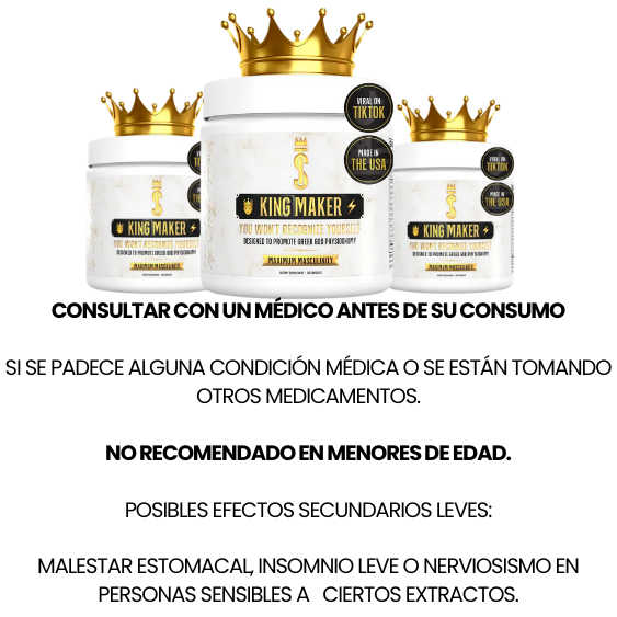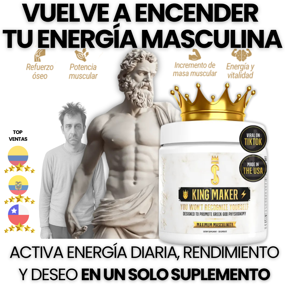 Muchos hombres sienten que algo se les está apagando: baja energía, poco rendimiento, deseo menor o menos confianza. King Maker es una fórmula completa que ayuda a recuperar vitalidad, apoyar el músculo, fortalecer el cuerpo y encender el deseo, para que vuelvas a sentirte dueño de tu energía y de tu masculinidad.